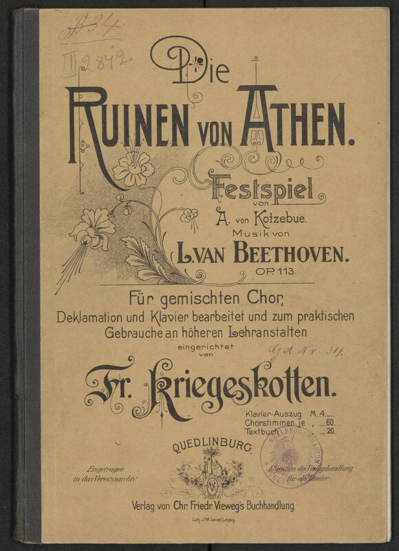 Die Ruinen von Athen : Festspiel von A. von Kotzebue : für gemischten Chor, Deklamation und Klavier bearbeitet und zum praktischen Gebrauchen an höheren Lehranstalten von Fr. Kriegeskotten : op. 113 - okładka przednia z pieczątką: Realprogymnasium Schlawe, Pom.