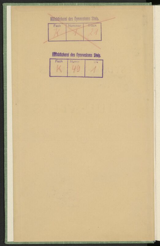 Sydow-Wagners Methodischer Schul-Atlas : 63 Haupt- und 51 Nebenkarten auf 47 Tafeln mit einem Namenverzeichnis / entworfen, bearb. und hrsg. von Hermann Wagner - wklejka górnej okładziny z fioletową pieczątką prostokątną: Hilfsbücherei des Gymnasiums Stolp