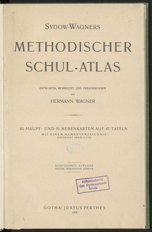 Sydow-Wagners Methodischer Schul-Atlas : 63 Haupt- und 51 Nebenkarten auf 47 Tafeln mit einem Namenverzeichnis / entworfen, bearb. und hrsg. von Hermann Wagner - strona tytułowa z fioletową prostokątną pieczątką: Hilfsbücherei des Gymnasiums Stolp