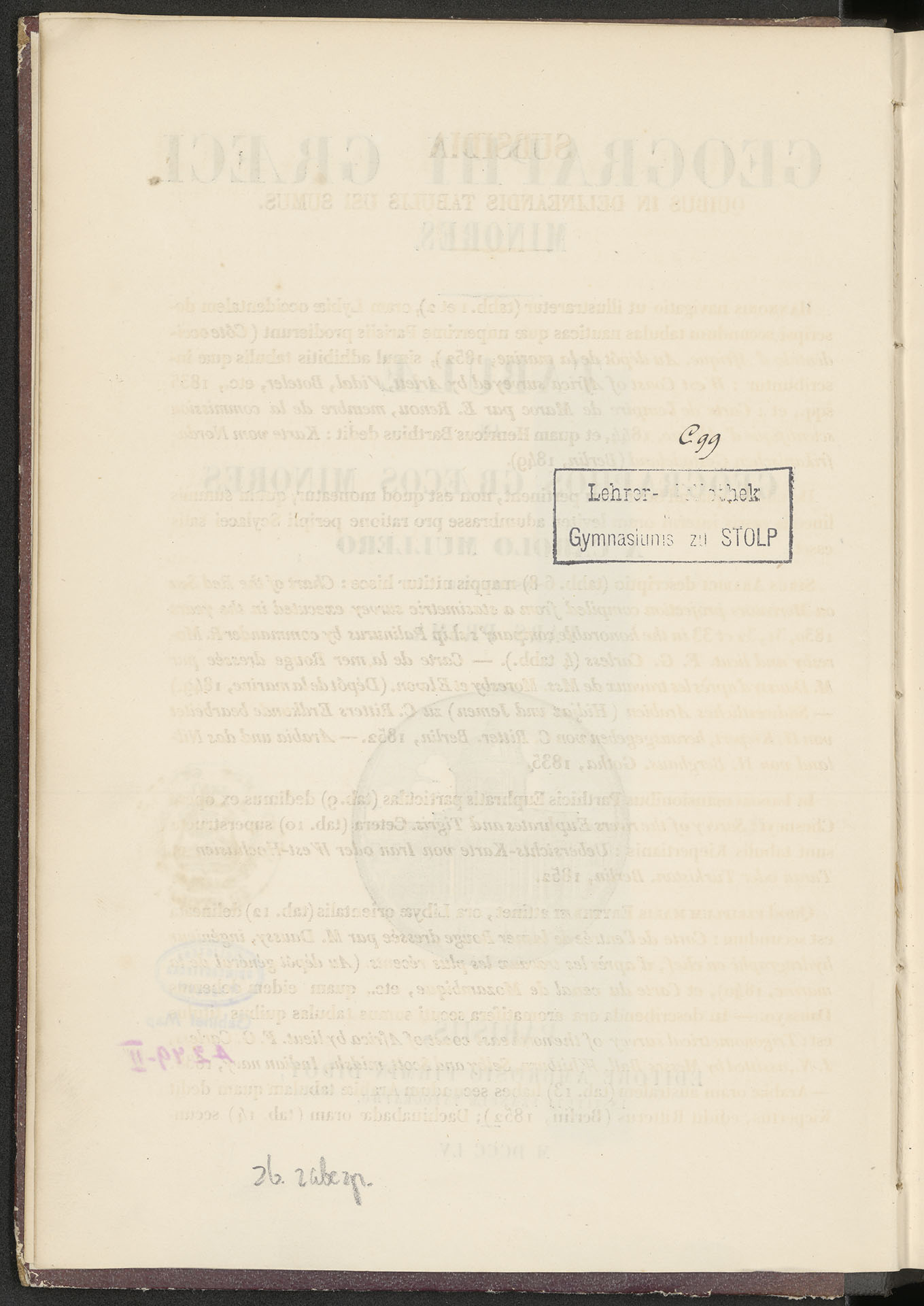 GEOGRAPHI GRAECI MINORES. TABULAE IN GEOGRAPHOS GRAECOS MINORES A CARLO MULLERO INSTRUCTAE. PARS PRIMA - strona z prostokątną pieczątką: Lehrer-Bibliothek des Gimnasiums zu STOLP