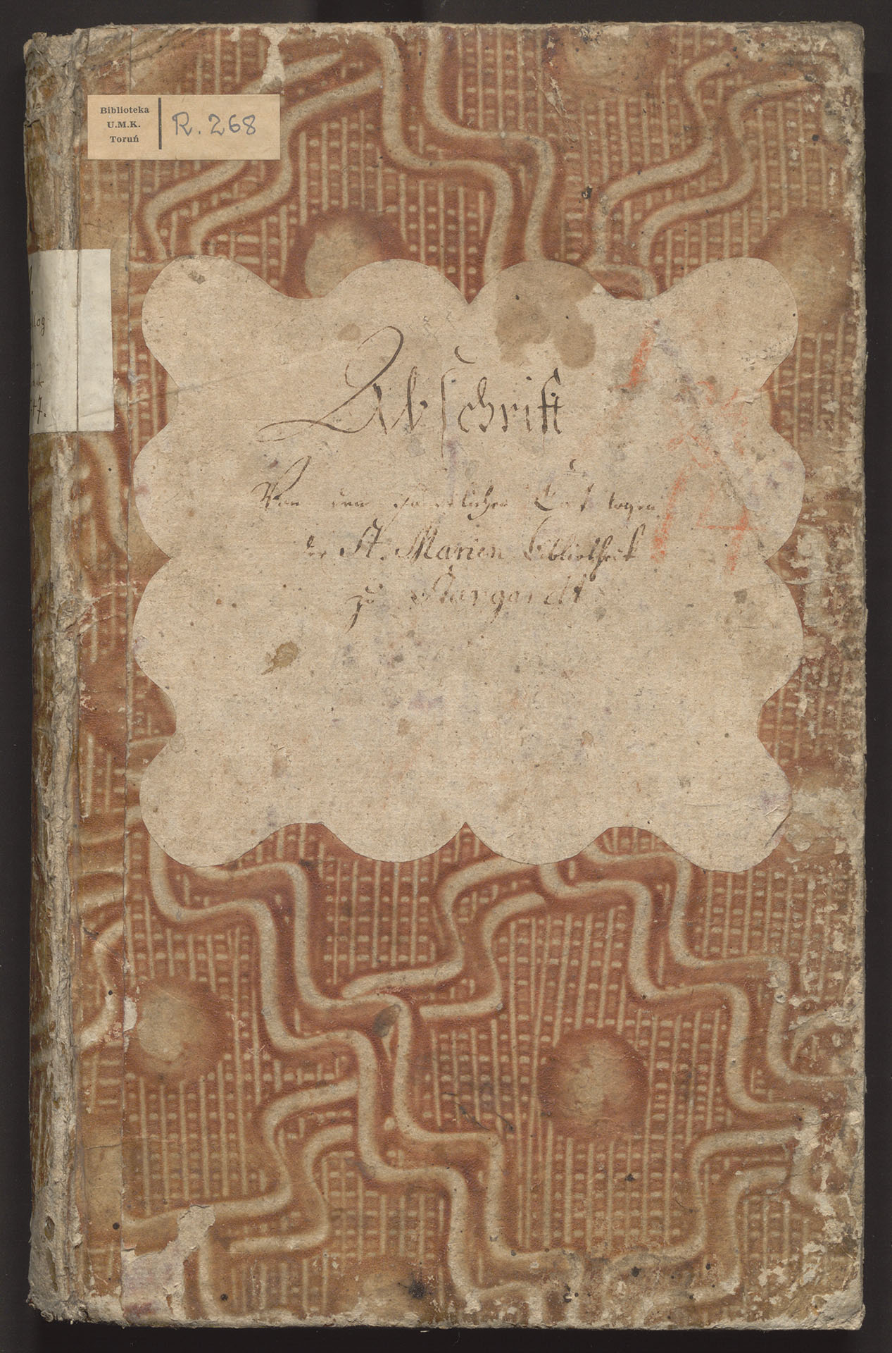 Odpis katalogów biblioteki kościoła NMP w Stargardzie - górna okładzina z naklejką: Abschrift von den samtlichen Catalogen der St. Marien-bibliothek zu Stargardt