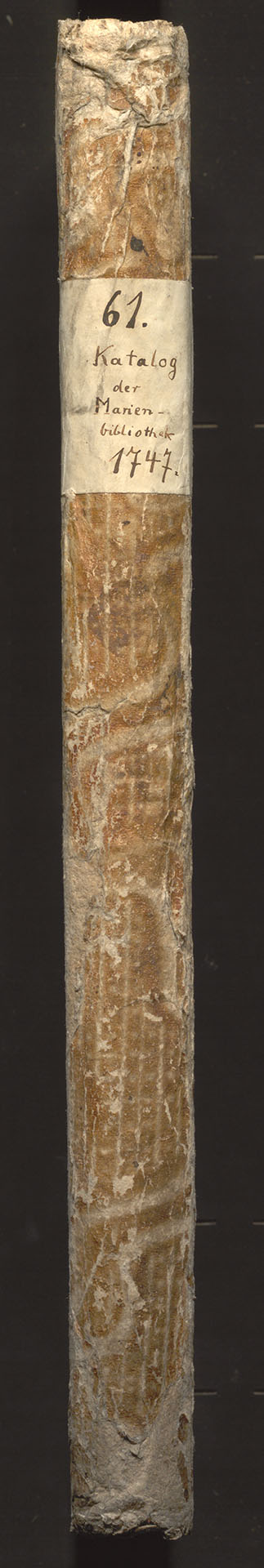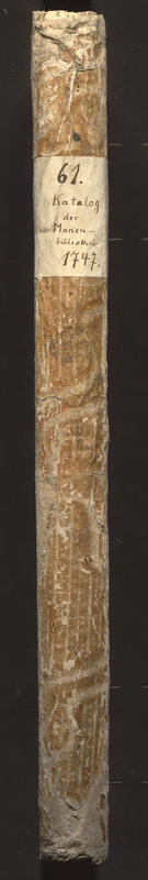 Odpis katalogów biblioteki kościoła NMP w Stargardzie - grzbiet z naklejką: 61. Katalog der Marienbibliothek 1747.
