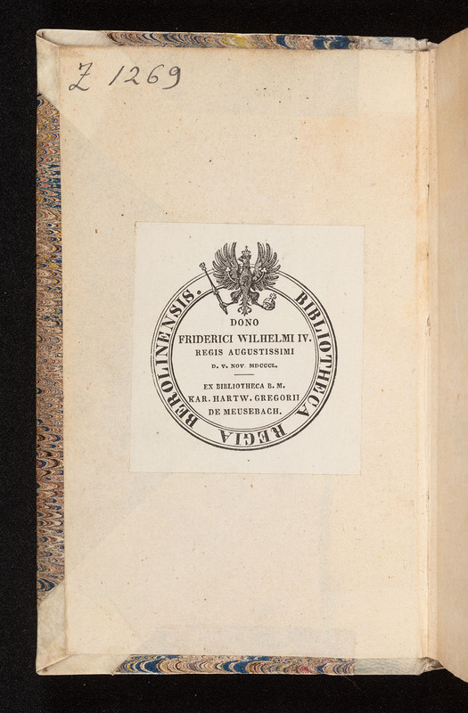 Der Clorinden Anderer Theil. Oder Liebs-Geschicht ... - ekslibris donacyjny „Bibliotheca Regia Berolinensis. Dono Friderici Wilhelmi IV Regis Augustissimi D. V. Nov. MDCCCL. Ex Bibliotheca B. M. Hartw. Gregorii De Meusebach.”