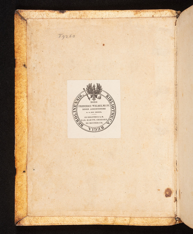 Geistliche Lieder vnnd Psalmen, Durch D. Martinum Lutherum, Vnd andern frommen Christen, nach ordnung der Jarzeit gestellet. - przednia wyklejka z ekslibrisem donacyjnym „Bibliotheca Regia Berolinensis. Dono Friderici Wilhelmi IV Regis Augustissimi D. V. Nov. MDCCCL. Ex Bibliotheca B. M. Hartw. Gregorii De Meusebach.”