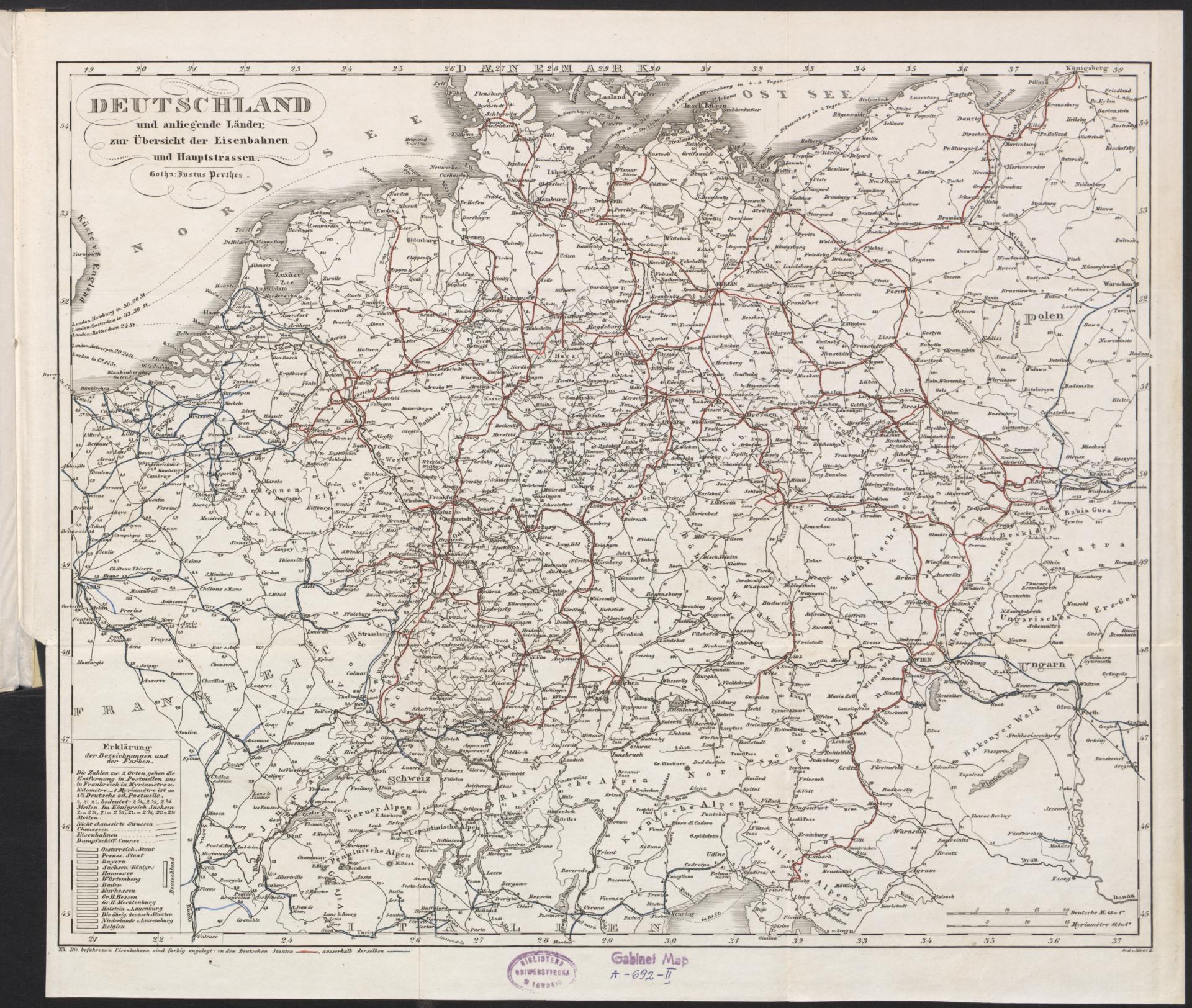 Part of Eisenbahn-Atlas von Deutschland, Belgien, Elsass und dem nördlichsten Theile von Italien : in 16 Specialkarten auf 13 Blättern, nebst einer Uebersichtskarte