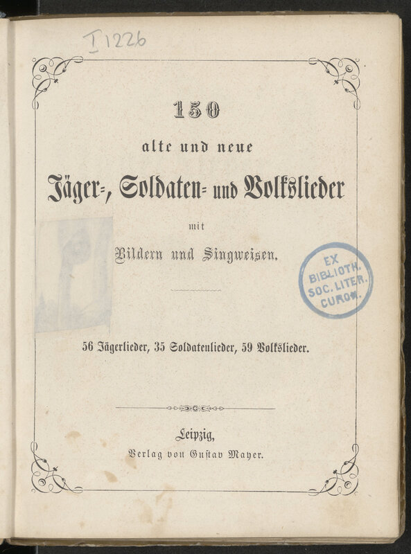 Part of 150 alte und neue Jäger-, Soldaten- und Volkslieder mit Bildern und Singweisen. 56 Jägerlieder, 35 Soldatenlieder, 59 Volkslieder