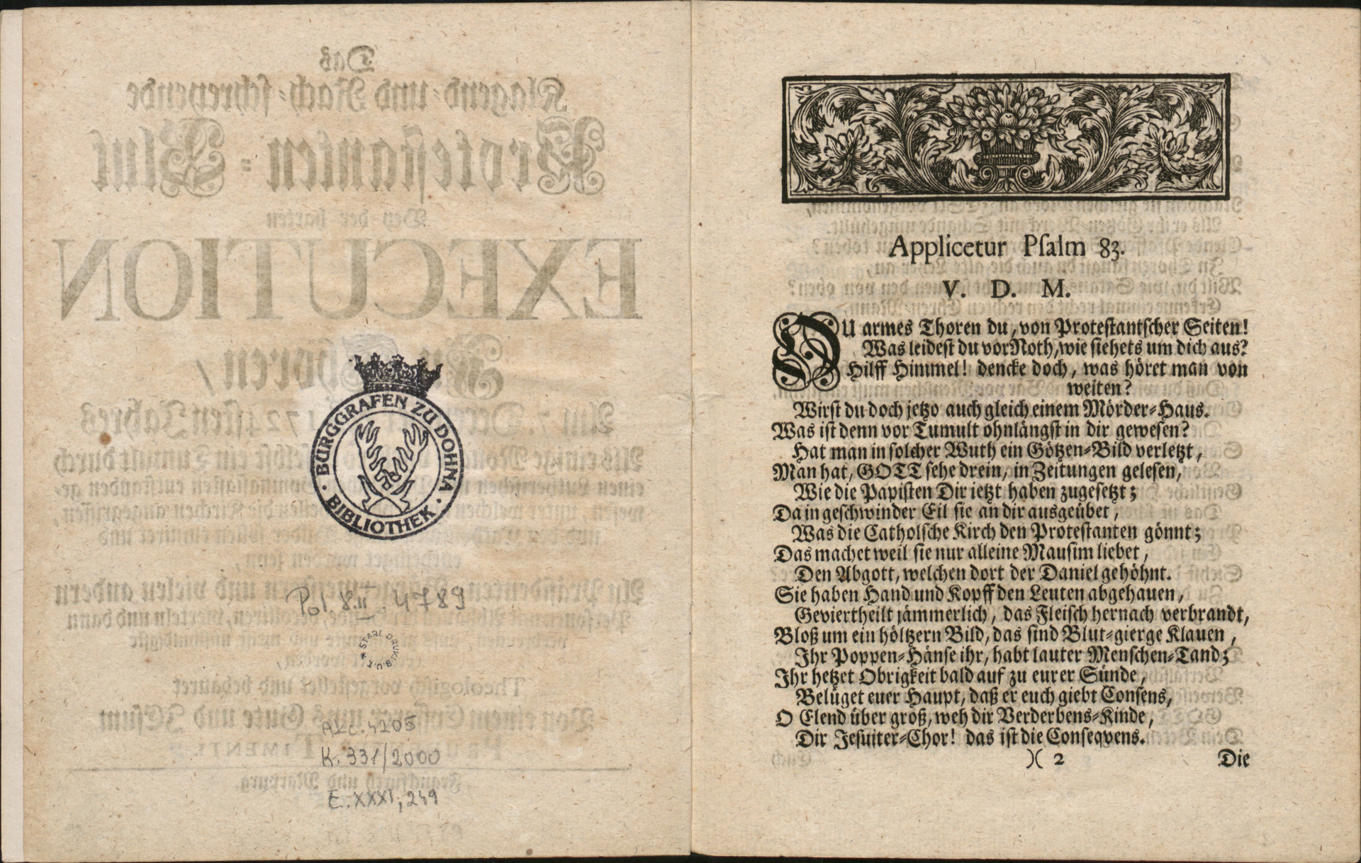 Das Klagend- und Rach-schreyende Protestanten-Blut... - strona verso z pieczątką i recto