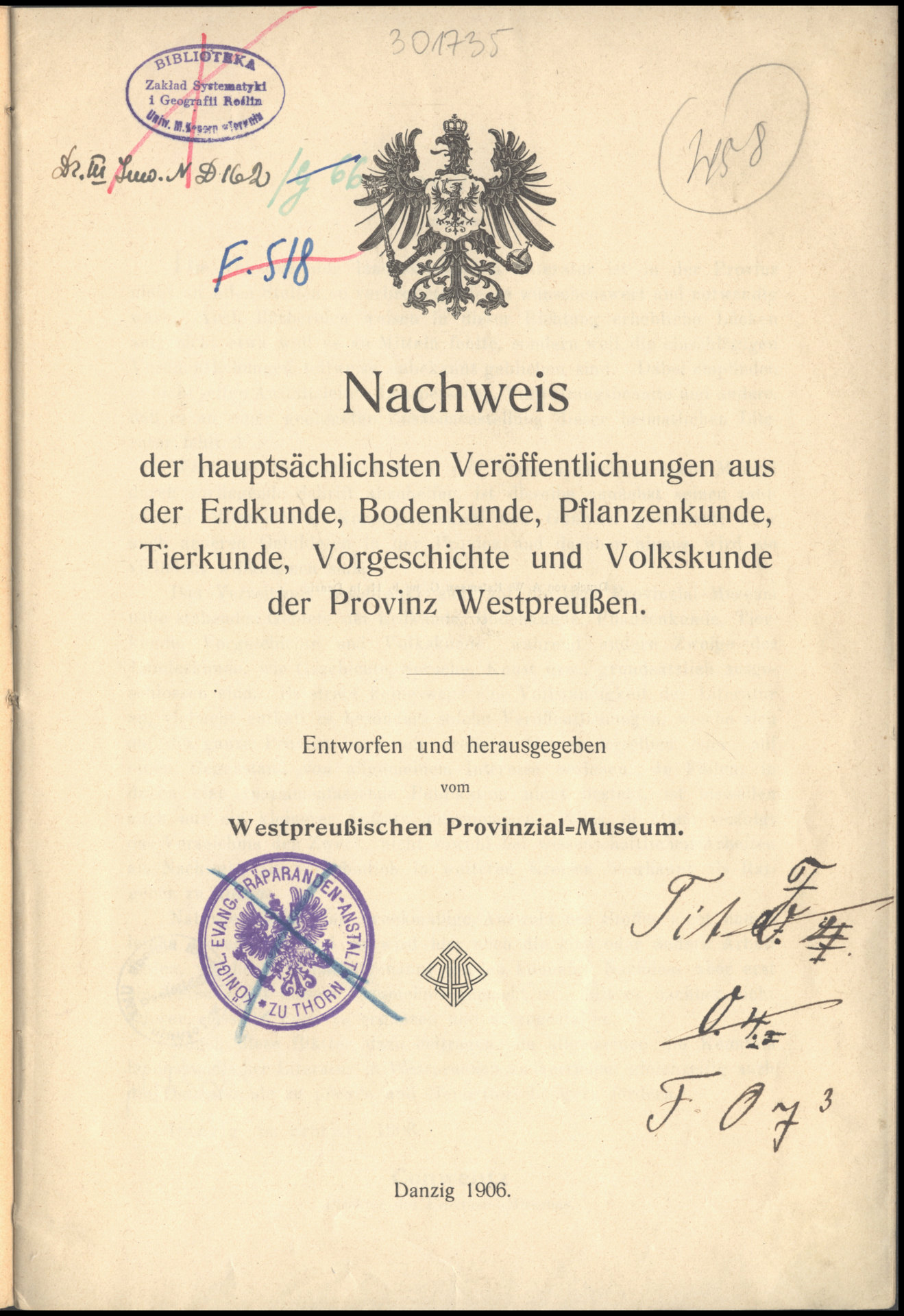 Part of Nachweis der hauptsächlichsten Veröffentlichungen aus der Erdkunde, Bodenkunde, Pflanzenkunde, Tierkunde, Vorgeschichte und Volkskunde der Provinz Westpreußen