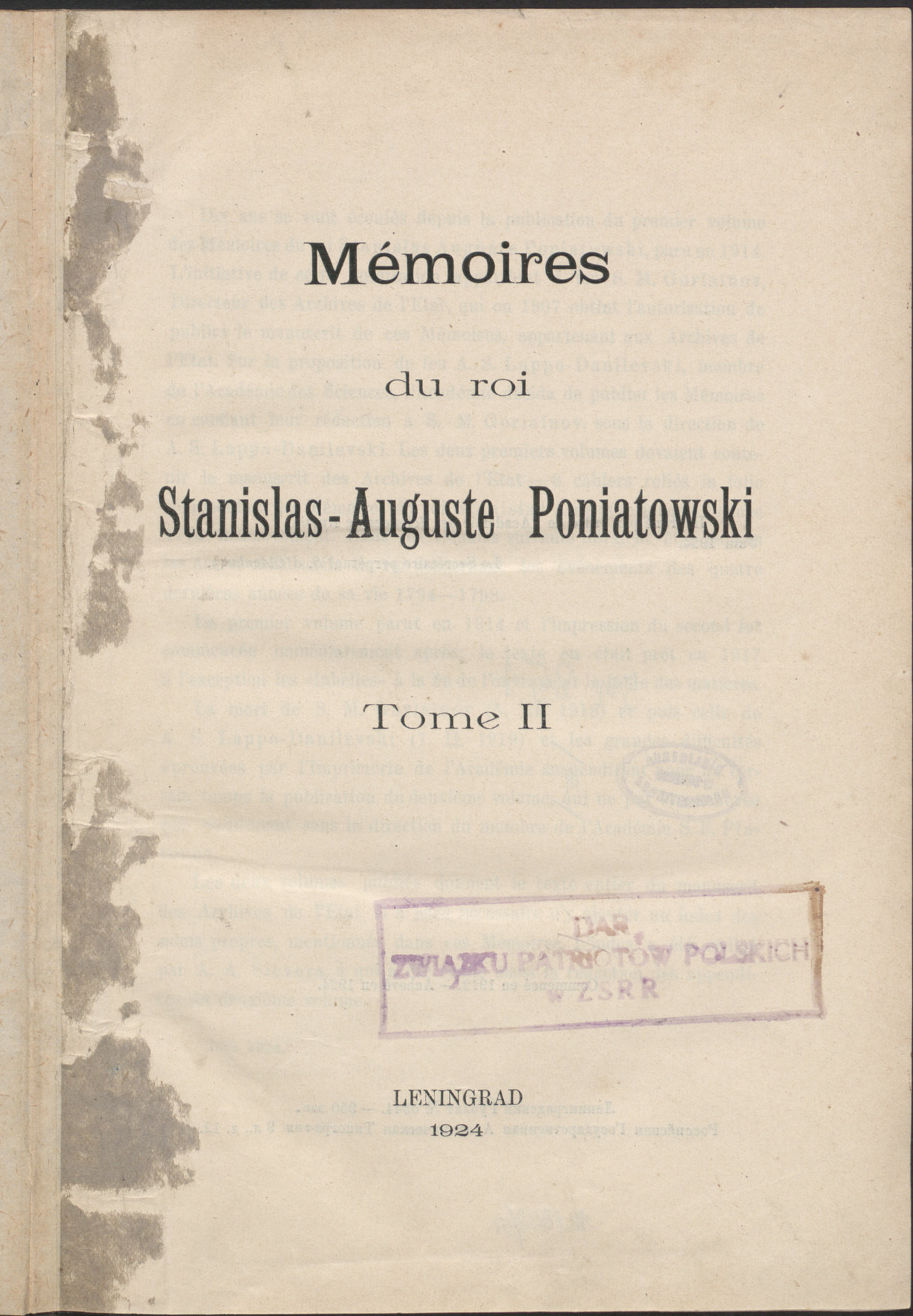 Mémoires du roi Stanislas-Auguste Poniatowski - strona tytułowa z pieczątką