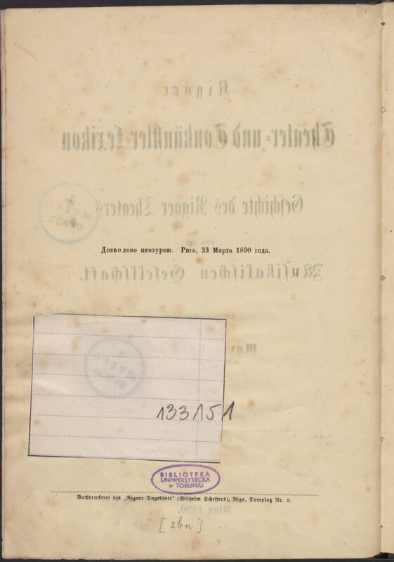 Rigaer Theater- und Tonkünstler-Lexikon : nebst Geschichte des Rigaer Theaters und der Musikalischen Gesellschaft - strona tytułowa verso
