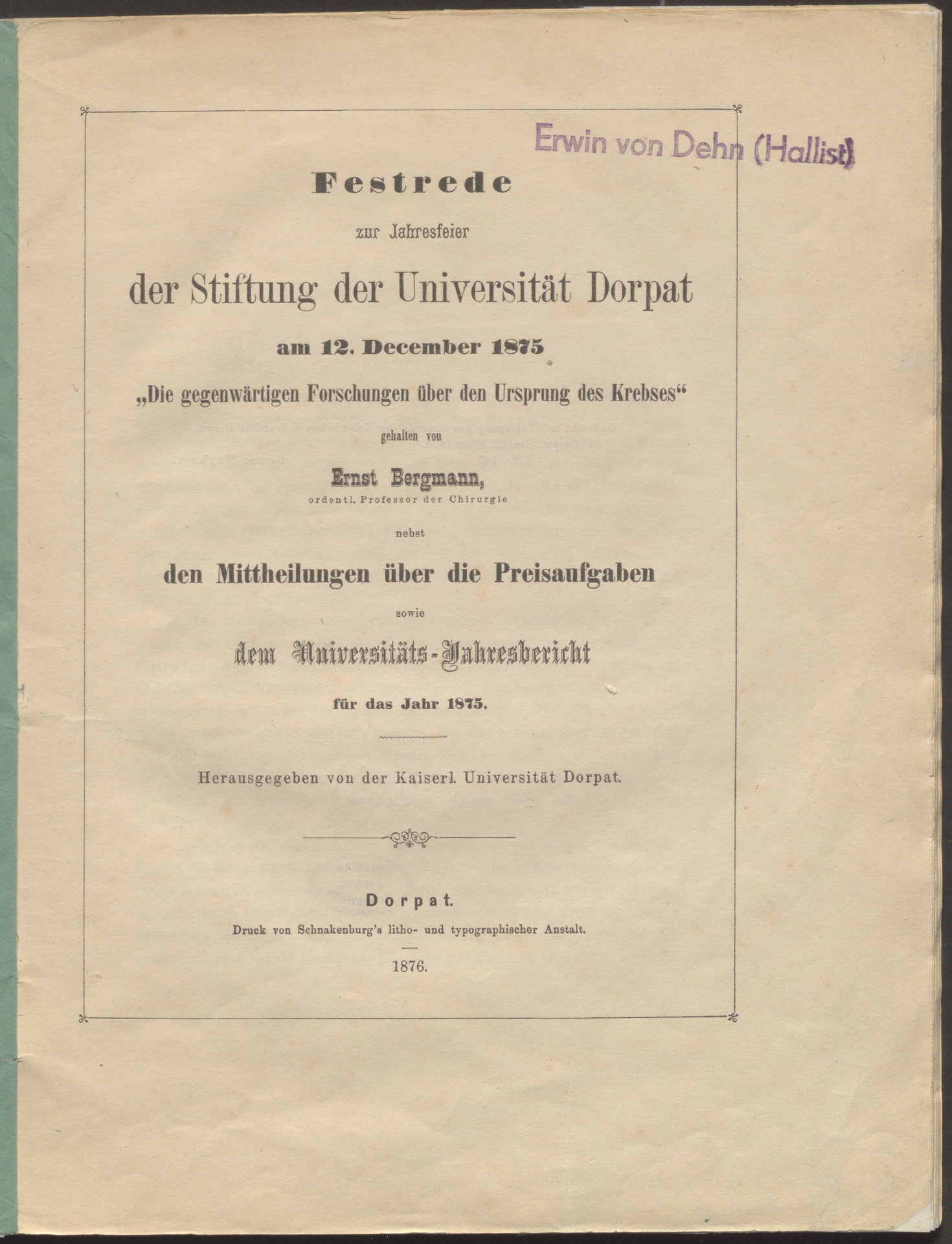 Part of Festrede zur Jahresfeier der Stiftung der Universität Dorpat am 12. December 1875 "Die gegenwärtigen Forschungen über den Ursprung des Krebses"