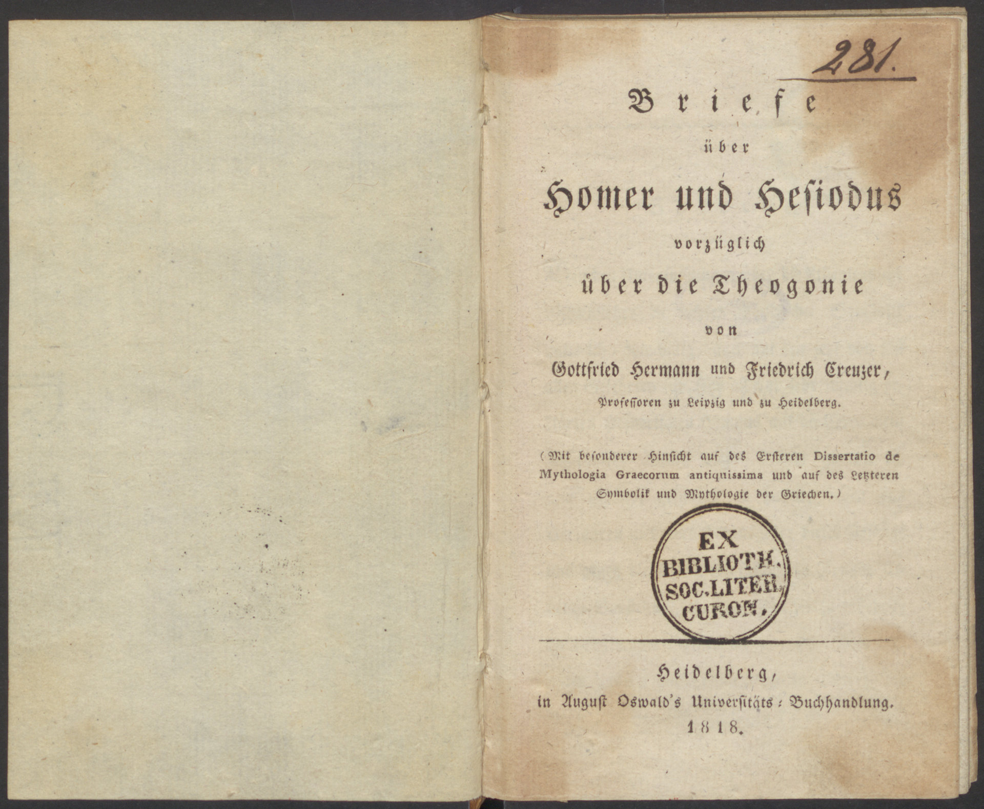 Briefe über Homer und Hesiodus vorzüglich über die Theogonie - strona tytułowa
