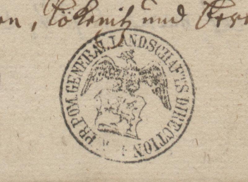 Beschreibung des Pommer Landes - pieczęć Generalnej Dyrekcji Ziemstwa Kredytowego w Szczecinie na karcie 1 recto