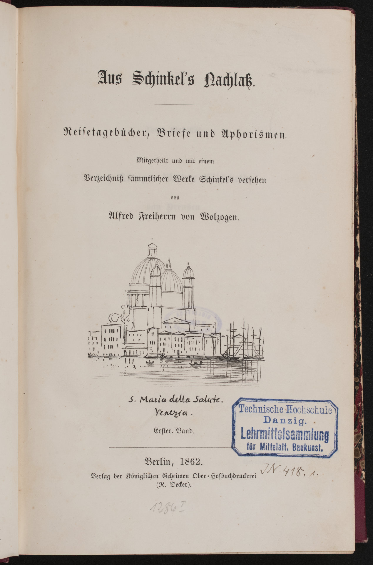 Aus Schinkel's Nachlasß s: Reisetagebücher, Briefe und Aphorismen. Bd. 1 - strona tytułowa z pieczątką