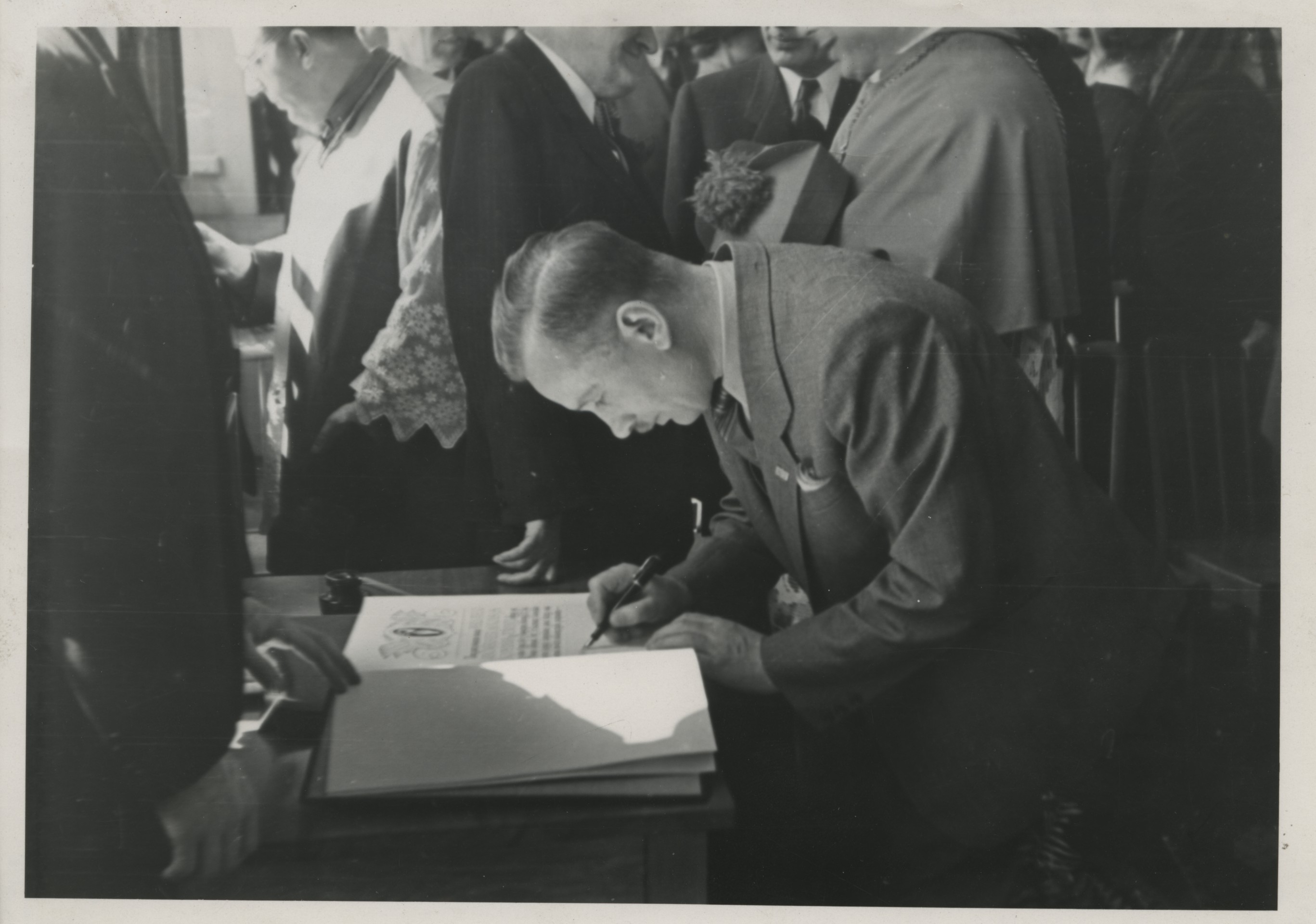 Uroczyste otwarcie Biblioteki Uniwersyteckiej w Toruniu, 10 maja 1947 r., podpisanie księgi pamiątkowej