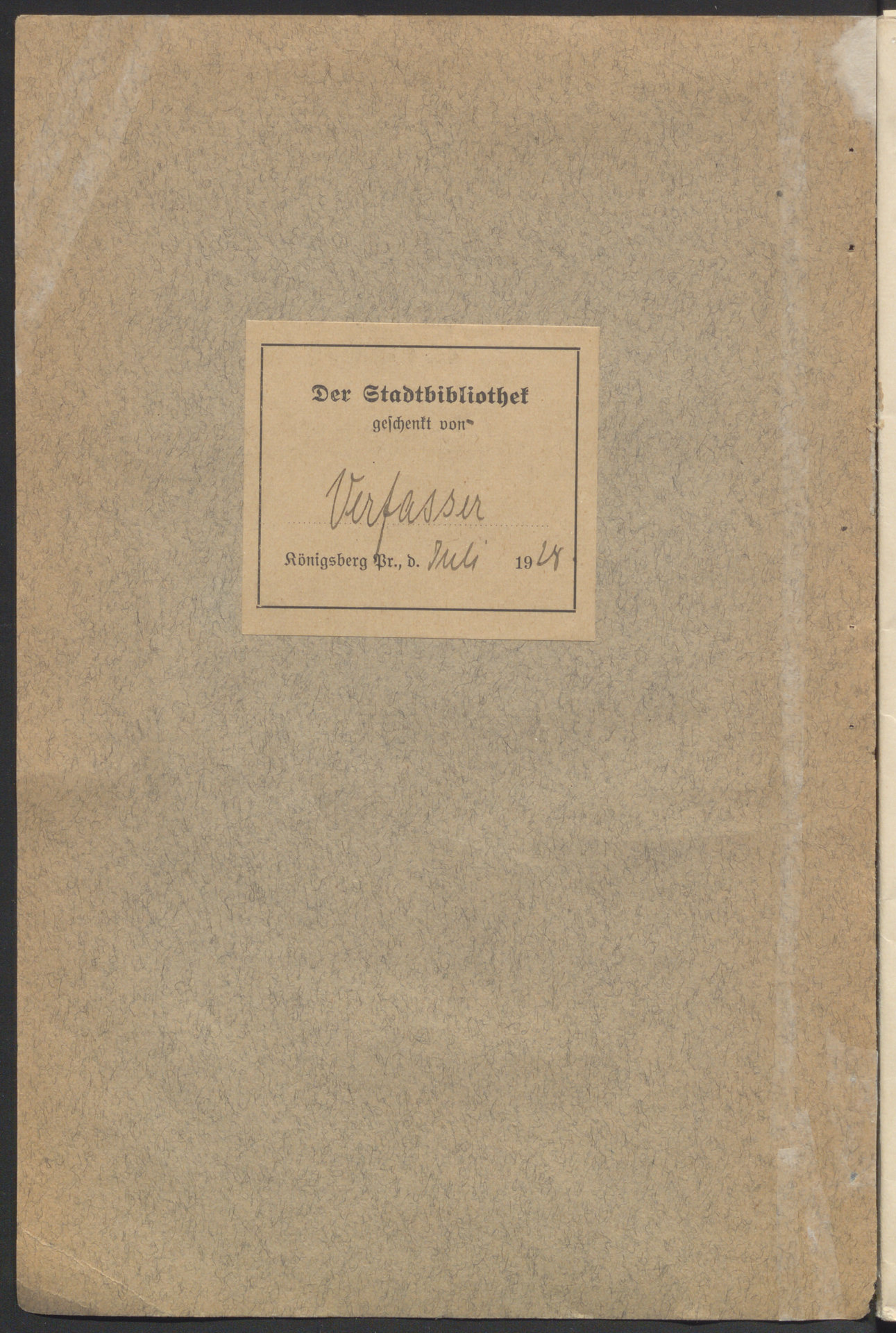 Von den Badern, Barbieren und Perückenmachern in Königsberg : Ein Beitrag zur Geschichte des Königsberger Zunftwesens - okładka verso z nalepką donacyjną: Der Stadtbibliothek geschenkt von Verfasser, Köigsberg Pr., d. Juli 1924.