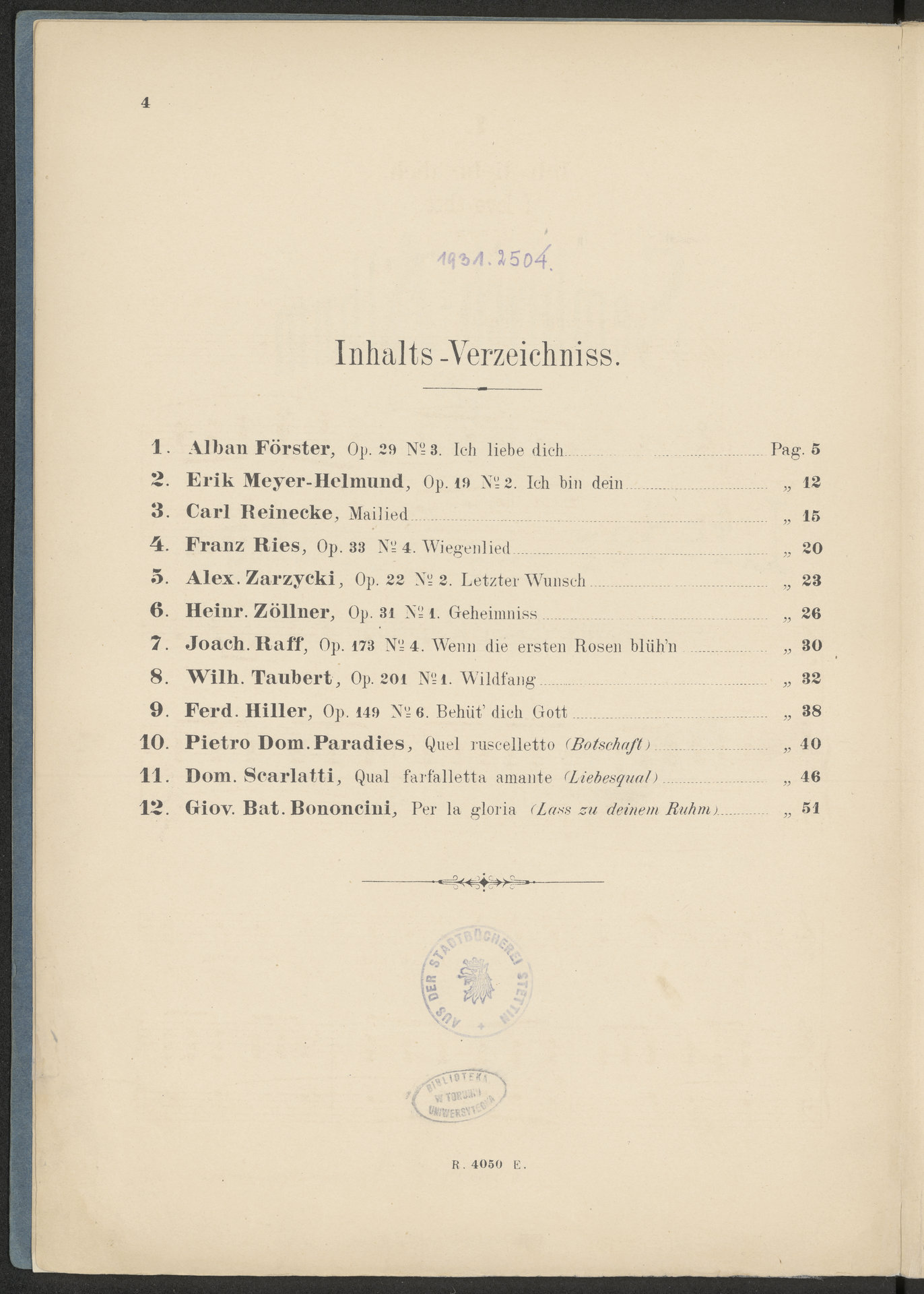 Sembrich-Album. 12 Lieder und Gesänge aus ihrem Repertoir - strona 4 z pieczątką: Aus der Stadtbücherei Stettin