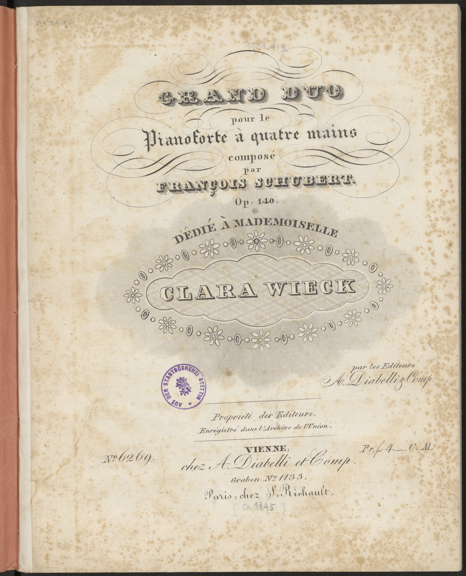 Grand Duo pour le Pianoforte à quatre mains : Op. 140 : Dédié à Mademoiselle Clara Wieck - strona tytułowa z pieczątką