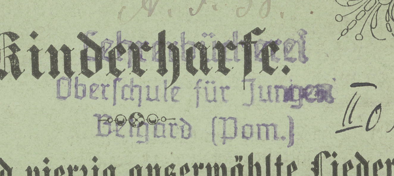 Kinderharfe. Sechs und vierzig auserwählte Lieder...für Knaben und Mädchen von 5-8 Jahren - pieczątka: Lehrerbücherei Oberschule für Jungen Belgard (Pom.)