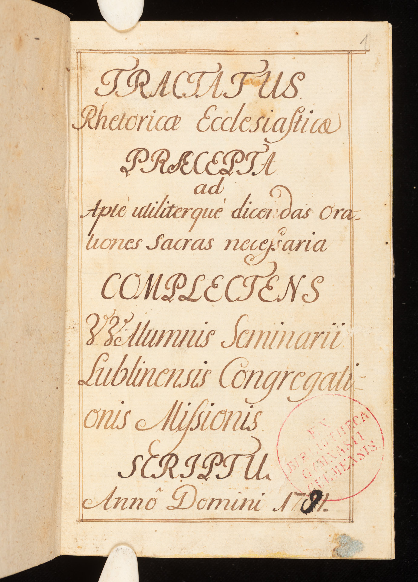 Part of Tractatus rhetoricae ecclesiasticae praecepta ad apte utiliterque dicendas orationes sacras necessaria complectens VV [Venerabilibus] Alumnis Seminarii Lublinensis Congregationis Missionis scriptu anno Domni 1791