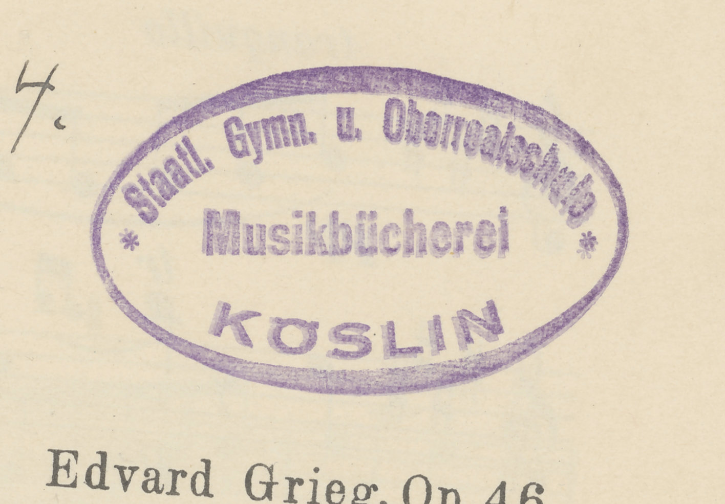 Erste Peer Gynt-Suite : für Klavier, Violine und Violoncello op. 46 - owalna pieczęć fioletowa: Staatl. Gymn. u. Oberrealschule Musikbücherei Köslin