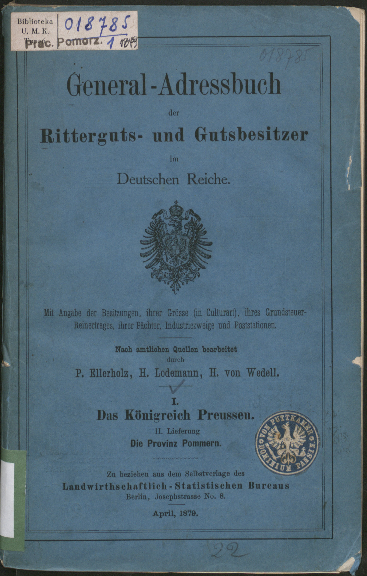 Part of General-Adressbuch der Ritterguts- und Gutsbesitzer im Deutschen Reiche : mit Angabe der Besitzungen, ihrer Grösse (in Culturart), ihres Grundsteuer-Reinertrages, ihrer Pächter, Industriezweige und Poststationen : nach amtlichen Quellen. 1, Das Königreich Preussen. Lfg. 2, Die Provinz Pommern