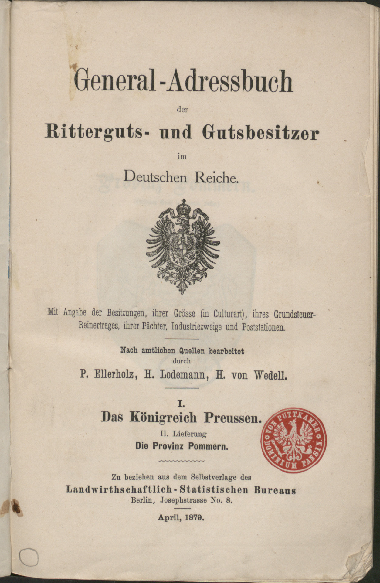 General-Adressbuch der Ritterguts- und Gutsbesitzer im Deutschen Reiche - strona tytułowa z pieczątką okrągłą z czerwonym tłem Von Puttkamer. Dominium Pansin