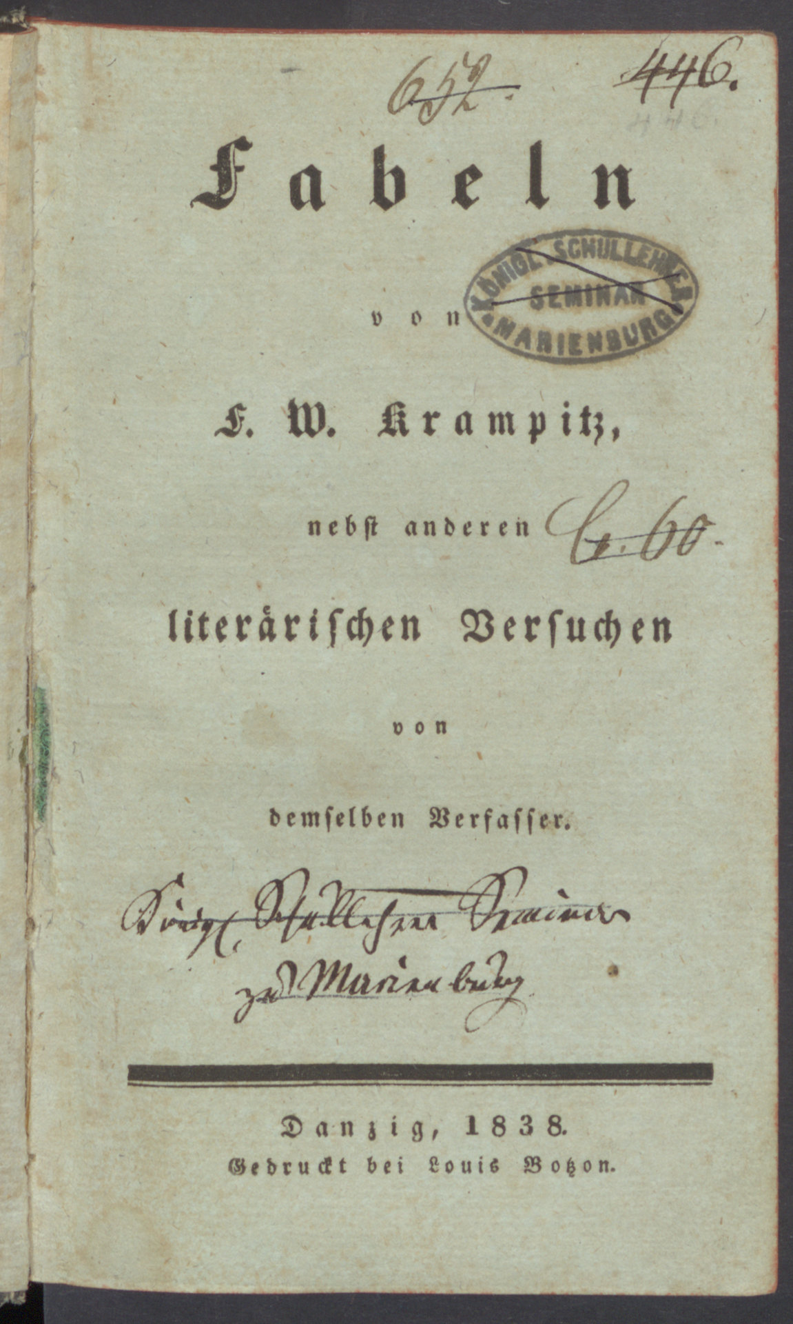 Fabeln : Nebst anderen literärischen Versuchen - strona tytułowa z pieczątką owalną: Kööigl. Schullehrer Seminar Marienburg