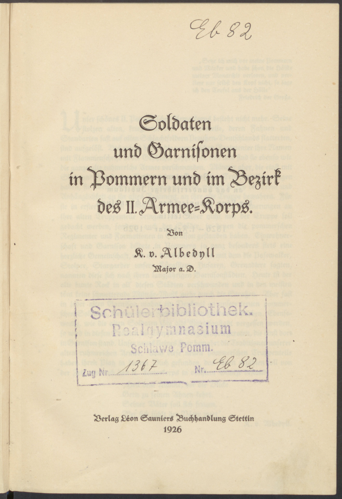 Soldaten und Garnisonen in Pommern und im Bezirk des 2. Armee-Korps - strona tytułowa z pieczątką
