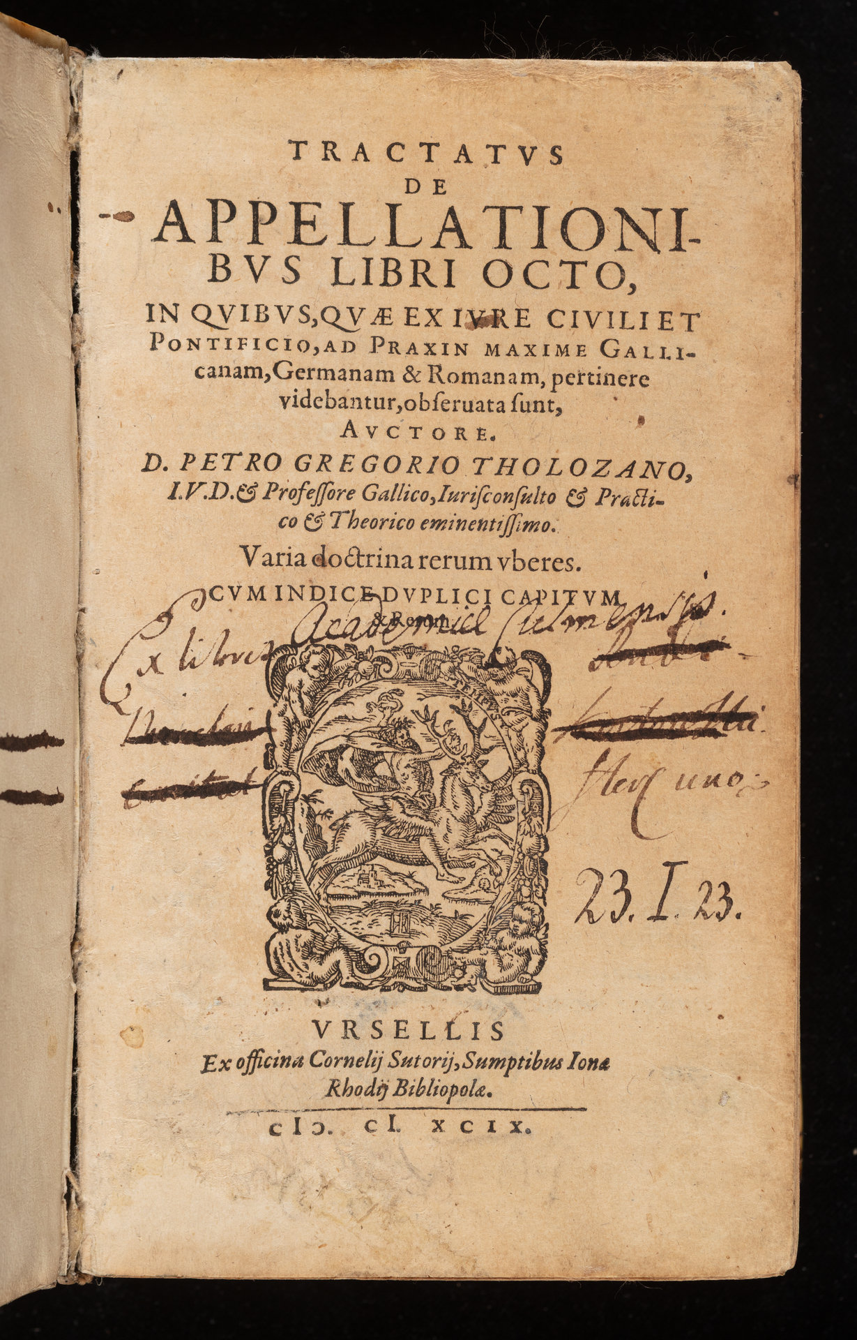 Tractatvs De Appellationibvs Libri Octo, In Qvibvs, Qvae Ex Ivre Civili Et Pontificio, Ad Praxin Maxime Gallicanam, Germanam & Romanam, pertinere videbantur, obseruata sunt ... - strona tytułowa z zapiską proweniencyjną i sygnaturą