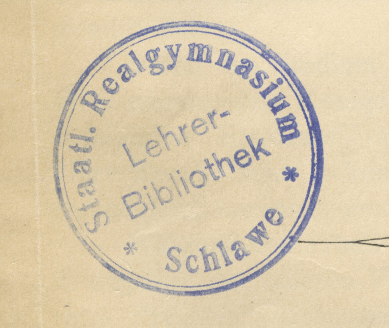1. Granatowa, okrągła pieczątka: Staatl. Realgymnasium. Lehrer-Bibliothek. Schlawe, sygnatura odręczna zapisana ołówkiem składająca się z litery i liczb arabskich.