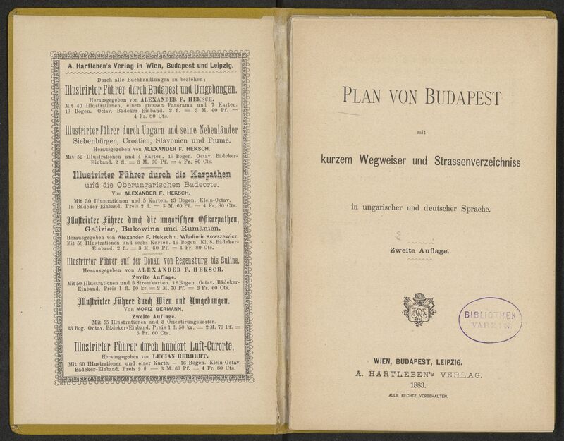 Plan von Budapest mit kurzem Wegweiser und Strassenverzeichniss in ungarischer und deutscher Sprache. Zweite Auflage - strona tytułowa z pieczątką