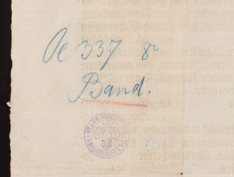 Burmistrz i rada miejska miasta Królewiec wydają poręczenie dla Johanna Michaela Banda z zaleceniem przyjęcia go do organizacji cechowych - sygnatura i pieczęć okrągła: Stadtbibliothek Königsberg i. Pr. (odwrocie dokumentu)