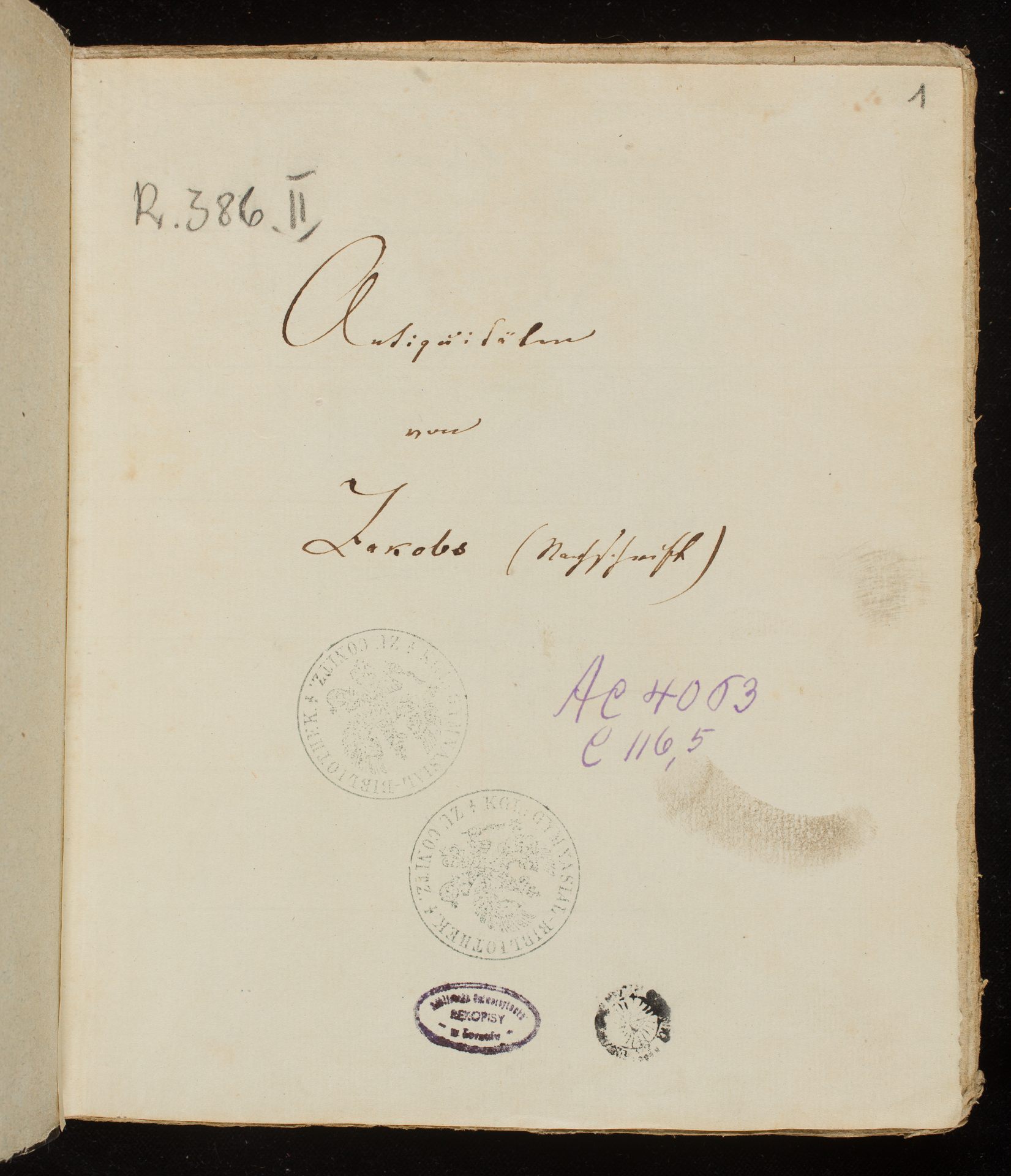 Antiquitäten von Jakobs. Notatki z kultury klasycznej - Carl Heinrich Froelich (nota własnościowa na karcie ochronnej); pieczęć okrągła: Kgl. Gymnasial-Bibliothek z Conitz, sygnatury: Ae 4063, e II 6, 5 - k. 1