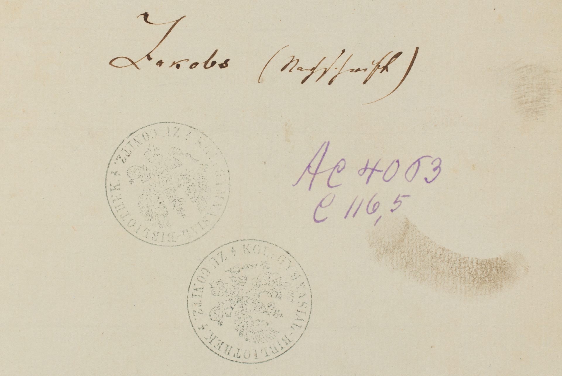 Antiquitäten von Jakobs. Notatki z kultury klasycznej - Carl Heinrich Froelich (nota własnościowa na karcie ochronnej); pieczęć okrągła: Kgl. Gymnasial-Bibliothek z Conitz, sygnatury: Ae 4063, e II 6, 5 - k. 1
