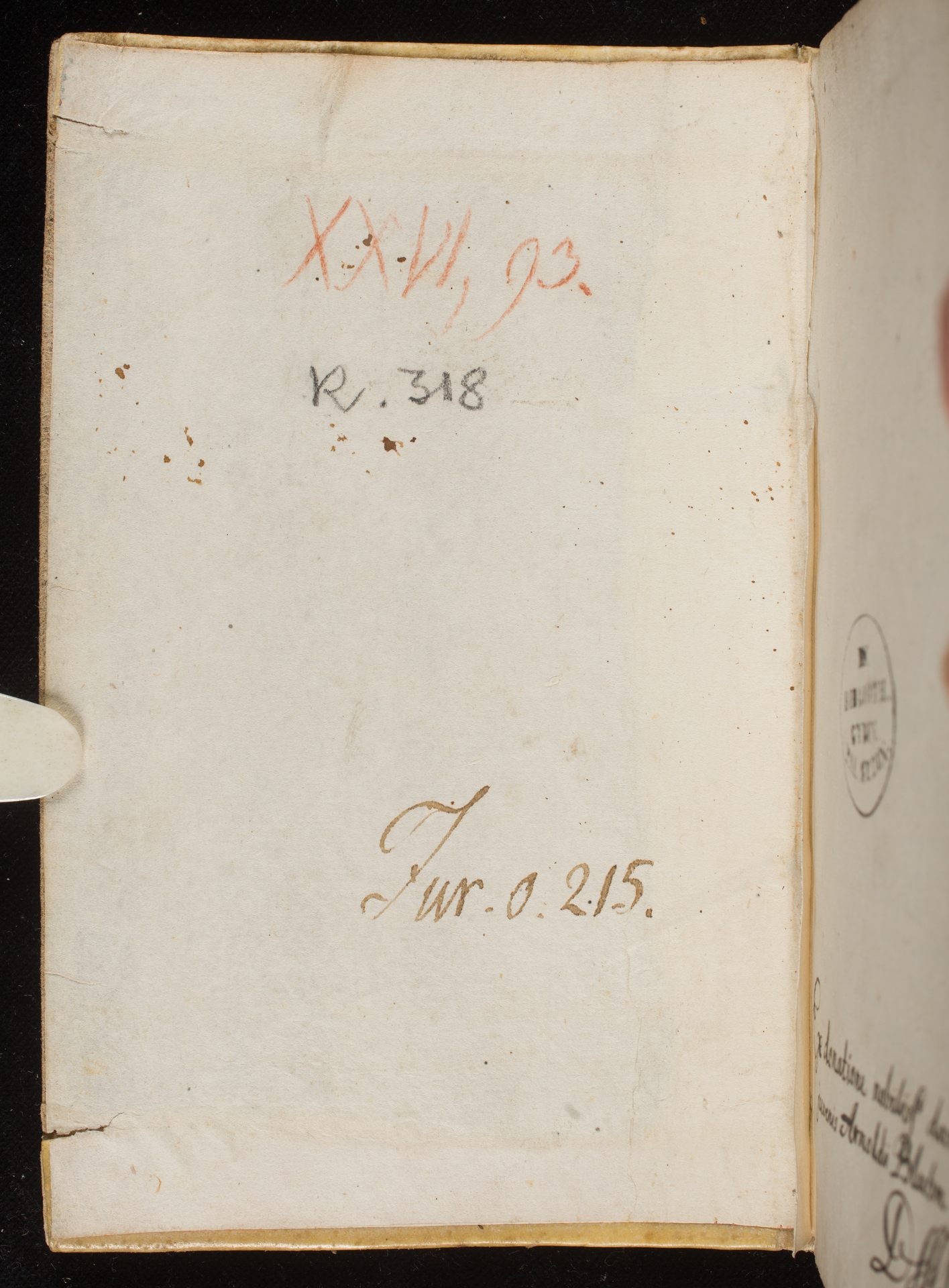 Noty z zakresu prawa miejskiego – wyklejka górnej okładziny z sygnaturami: Jur. 0. 215 oraz czerwoną kredką „XXVI, 93”