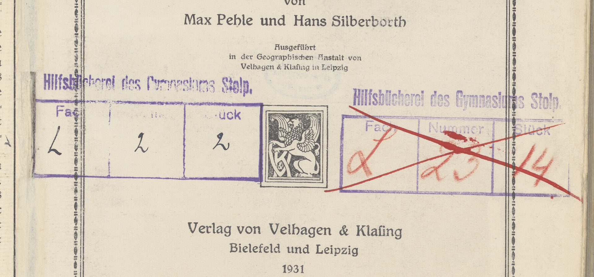 F. W. Putzgers Historischer Schul-Atlas - 2 pieczątki prostokątne: Hilfsbücherei des Gymnasiums Stolp