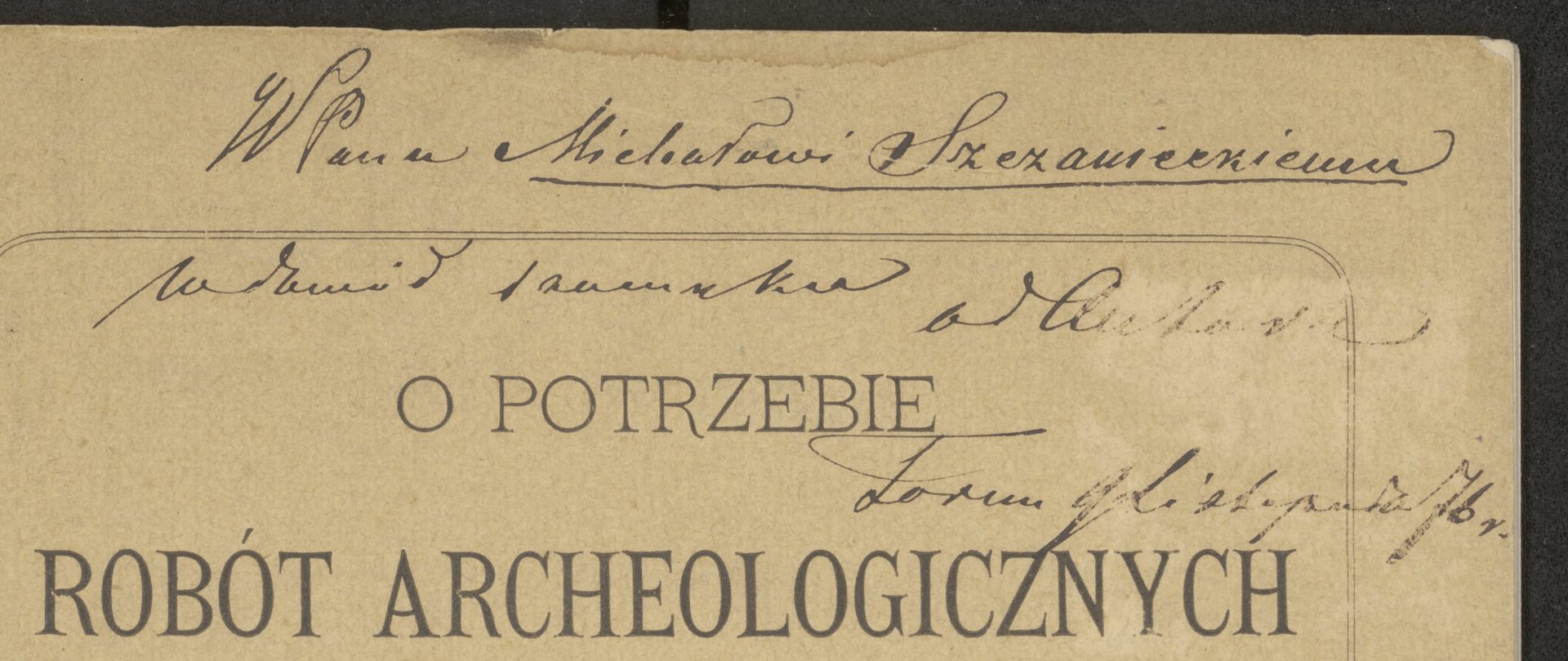 O potrzebie robót archeologicznych w Prusach Zachodnich... - odręczna dedykacja Godfryda Ossowskiego (1835-1897), polskiego archeologa, twórcy mapy archeologicznej Pomorza dla Jana Sczanieckiego