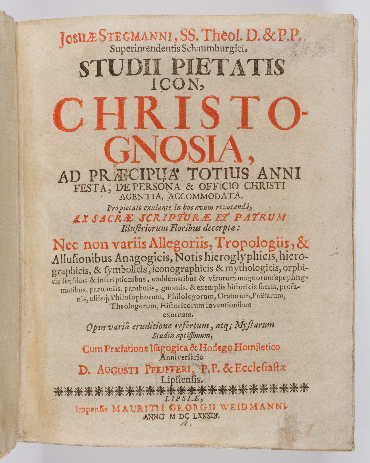Part of Josuæ Stegmanni ... Studii Pietatis Icon, Christognosia, Ad Praecipua Totius Anni Festa, De Persona & Officio Christi Agentia, Accommodata : Pro pietate exulante in hoc ævum revocanda, Ex Sacræ Scripturæ Et Patrum Illustriorum Floribus decerpta ...