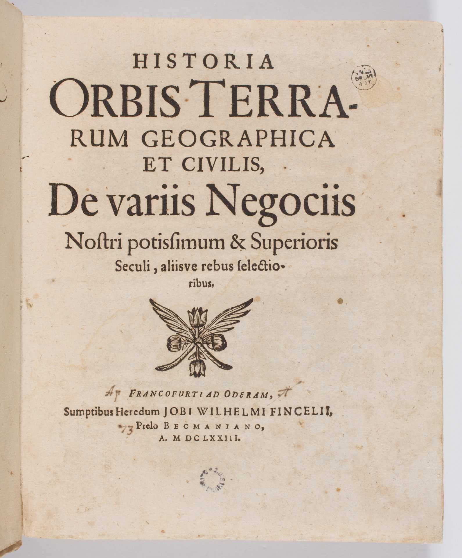 Historia Orbis Terrarum Geographica Et Civilis : De variis Negociis Nostri potissimum & Superioris Seculi, aliisve rebus selectioribus - strona tytułowa