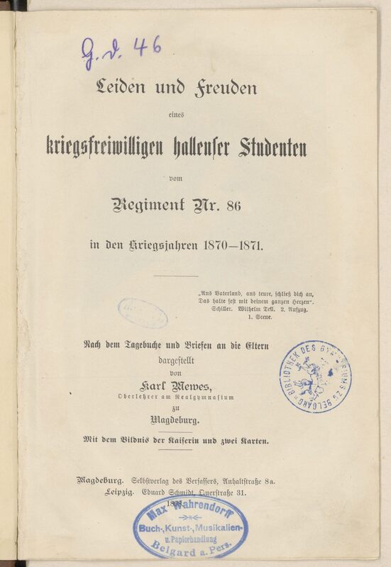 Leiden und Freuden eines kriegsfreiwilligen hallenser Studenten vom Regiment Nr 86 in den Kriegsjahren 1870-1871 - pieczątka owalna: księgarza Max Wahrendorff. Buch-Kunst-, Musikalien- u. Papierhandlung Belgard a. Pers.; pieczątka okrągła: Bibliothek des Gymnasiums zu Belgard