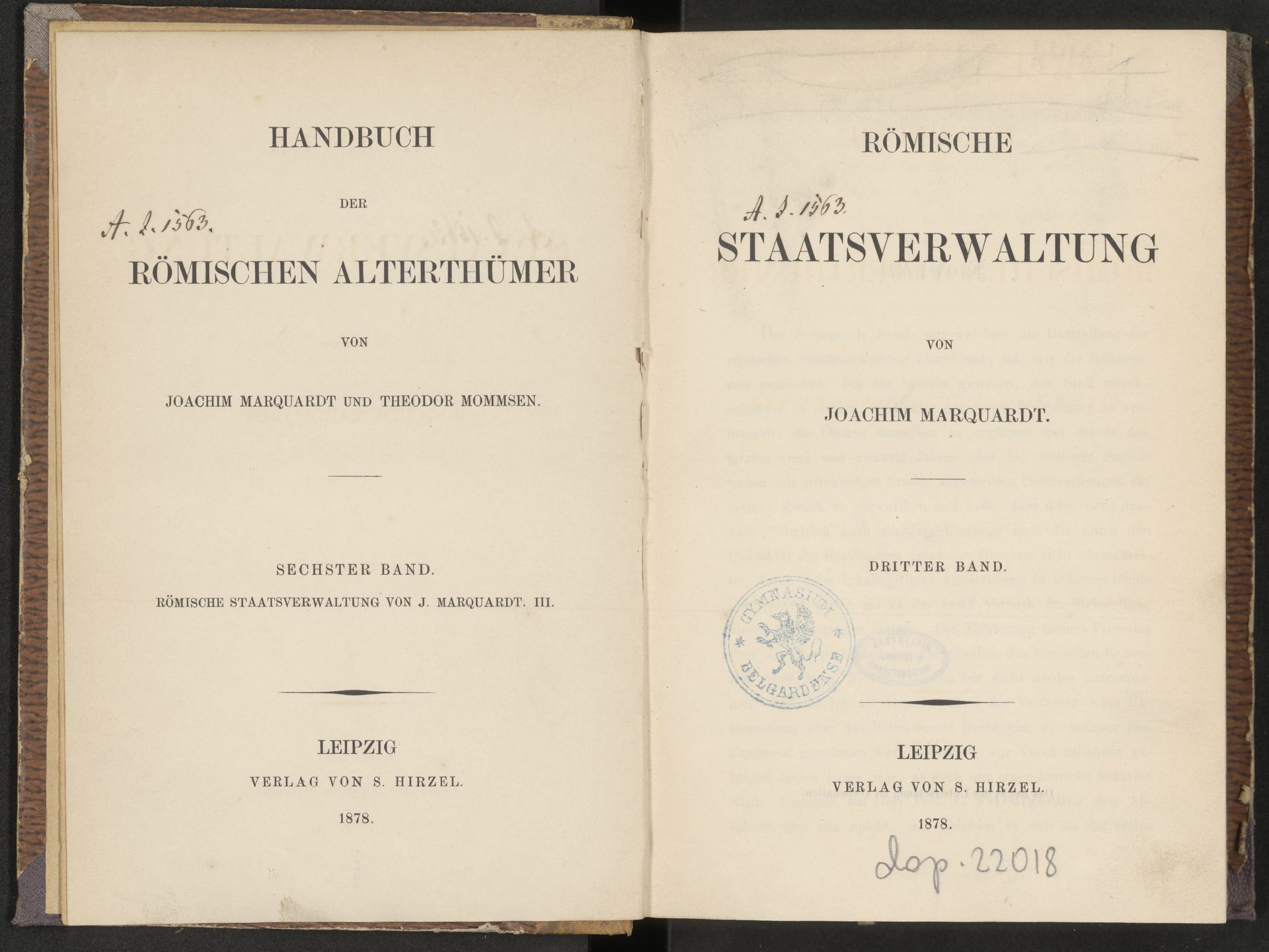 Römische Staatsverwaltung. Bd. 3. - strona z sygnaturą i pieczątką: Gymnasium Belgardense