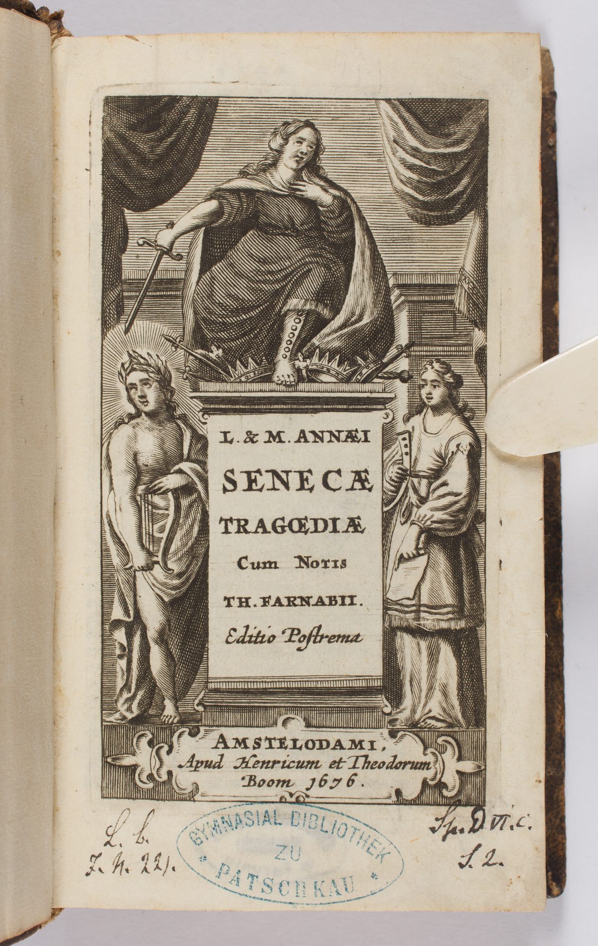 L. & M. Annæi Senecæ Tragoediæ Cum Notis Th. Farnabii. - strona tytułowa z pieczątką: "Gymnasial Bibliothek zu Patschkau"