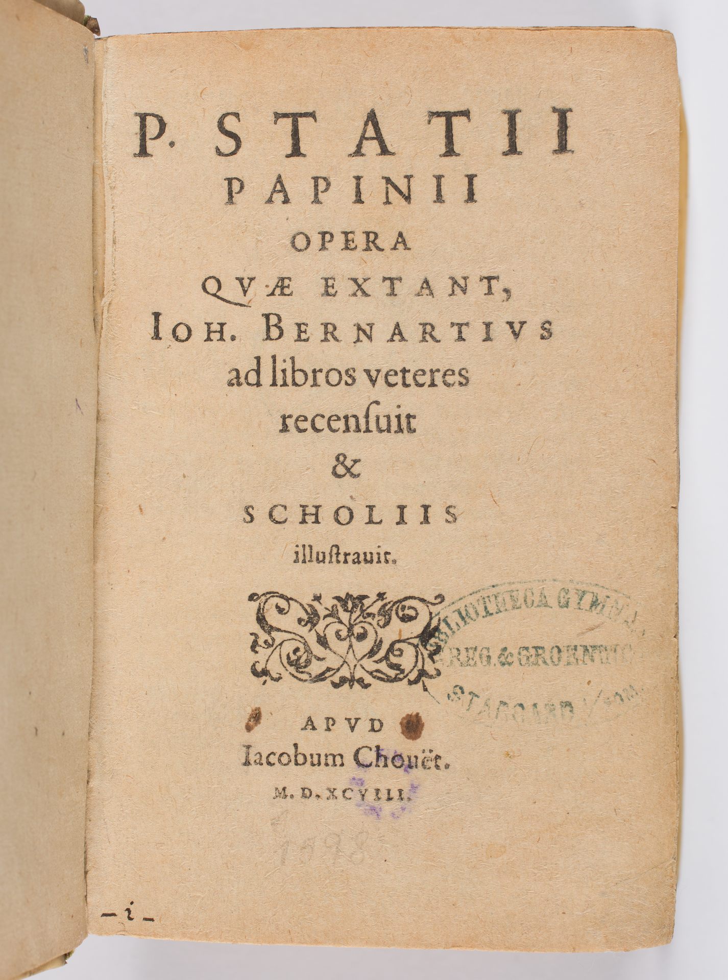Part of P. Statii Papini Opera quae extant, Ioh. Bernartius ad libros veteres recensuit & scholiis illustravit.