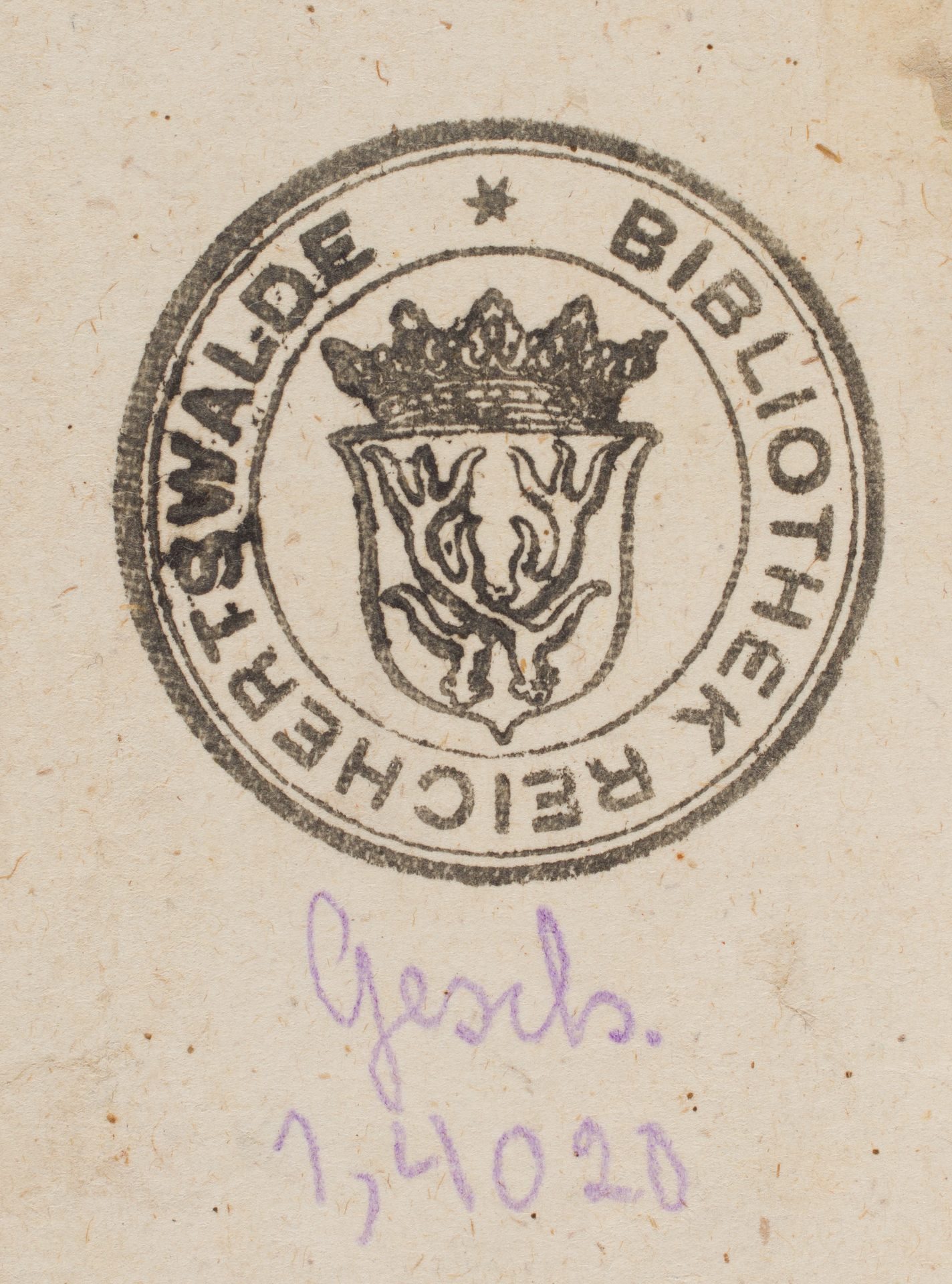 Mores, Leges, Et Ritvs Omnivm Gentivm - pieczątka herbowa "Bibliothek Reichertswalde"