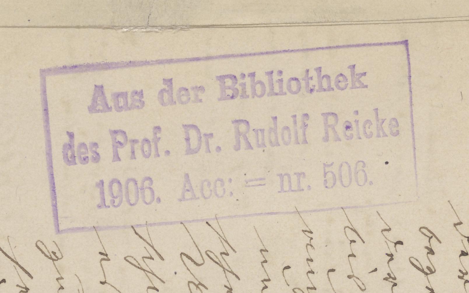 Vocale und instrumentale Musikaufführungen in Elbing vom J. 1800 bis 1864 - pieczęć prostokątna: Aus der Bibliothek des Prof. Dr. Rudolf Reicke 1906 Acc. nr 506 (k. 1r)