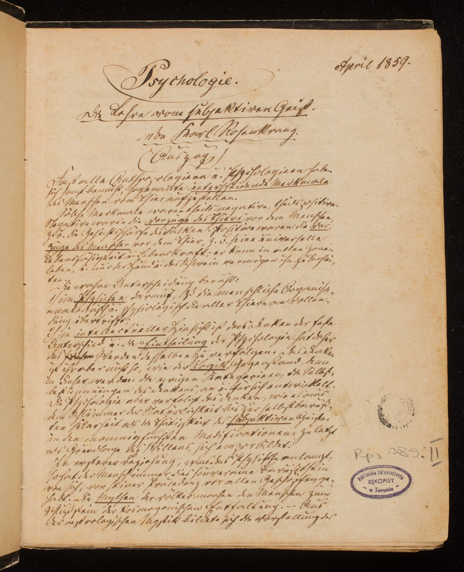 Psychologie. Die Lehre vom Subjektiven Geist. Wykład prof. K. Rosenkranza - 1 strona rękopisu