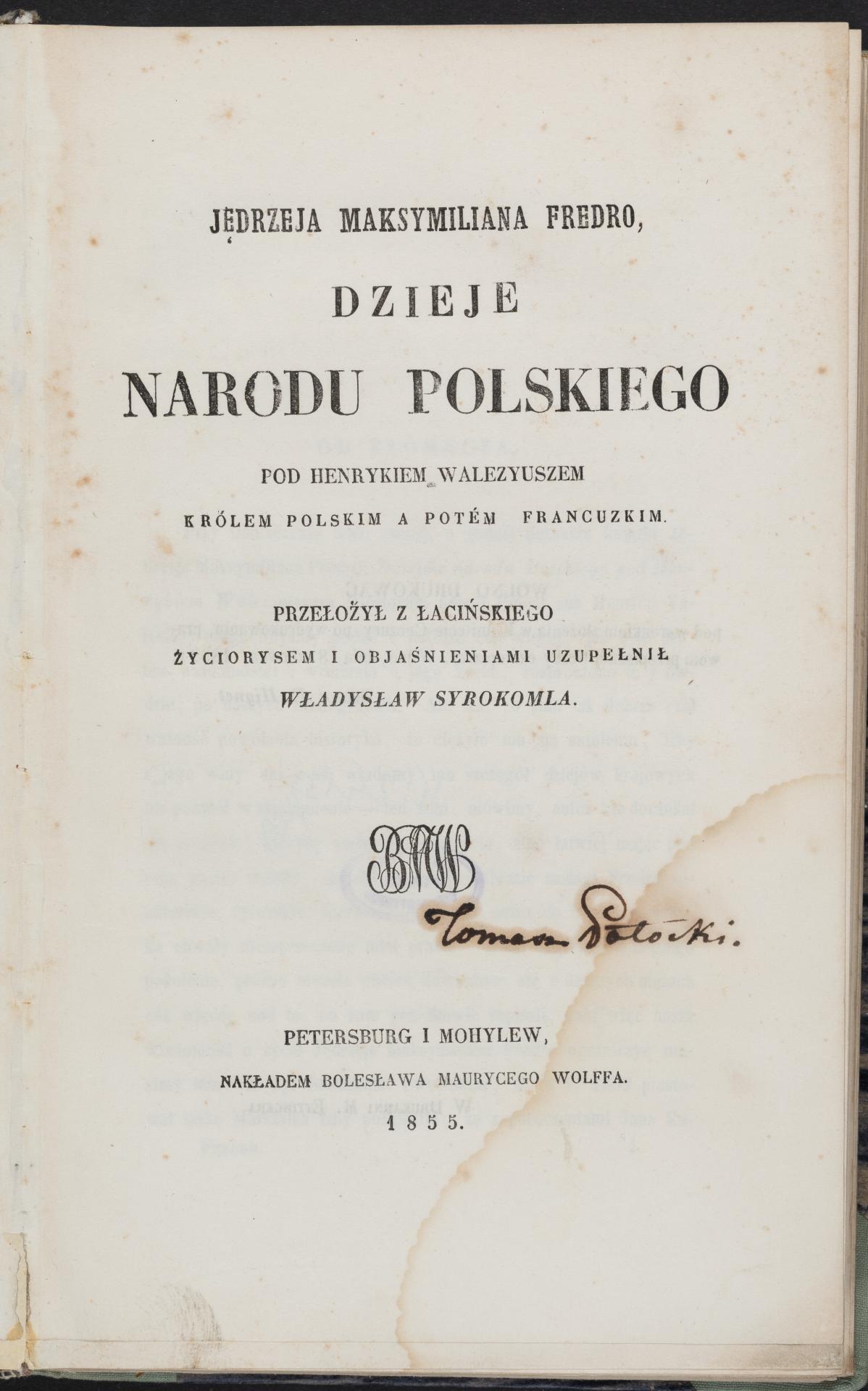 Part of Jędrzeja Maksymiliana Fredro Dzieje narodu polskiego pod Henrykiem Walezyuszem królem polskim a potém francuzkim