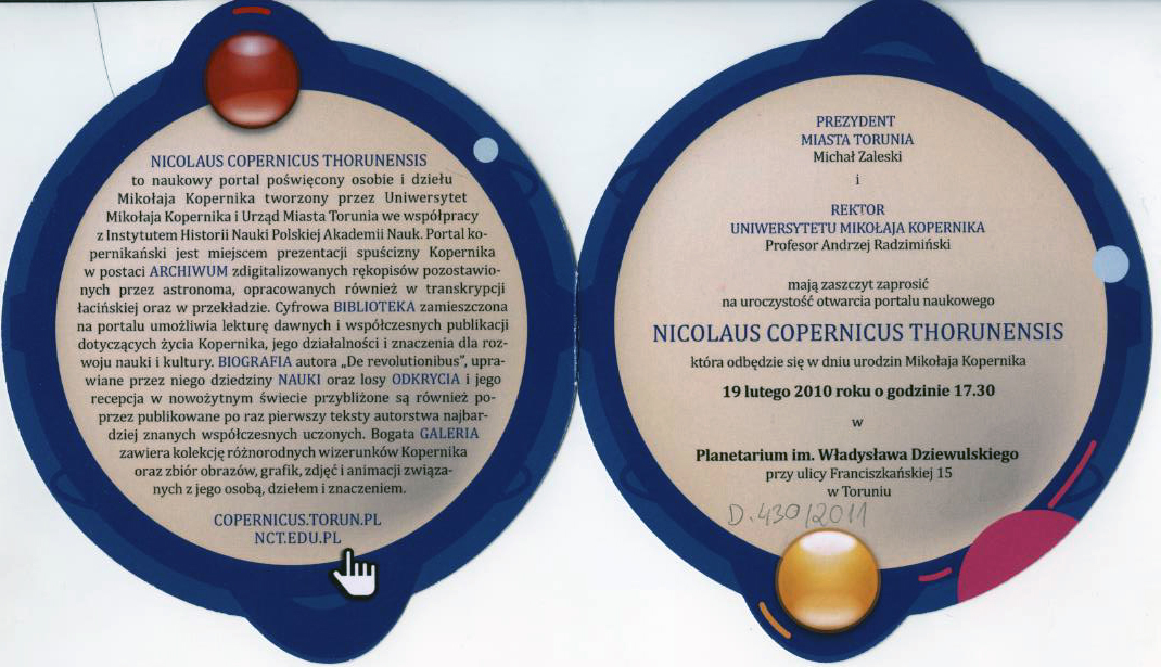 Otwarcie portalu Kopernikowskiego Nicolaus Copernicus Thorunensis w Toruniu, 19 lutego 2010
