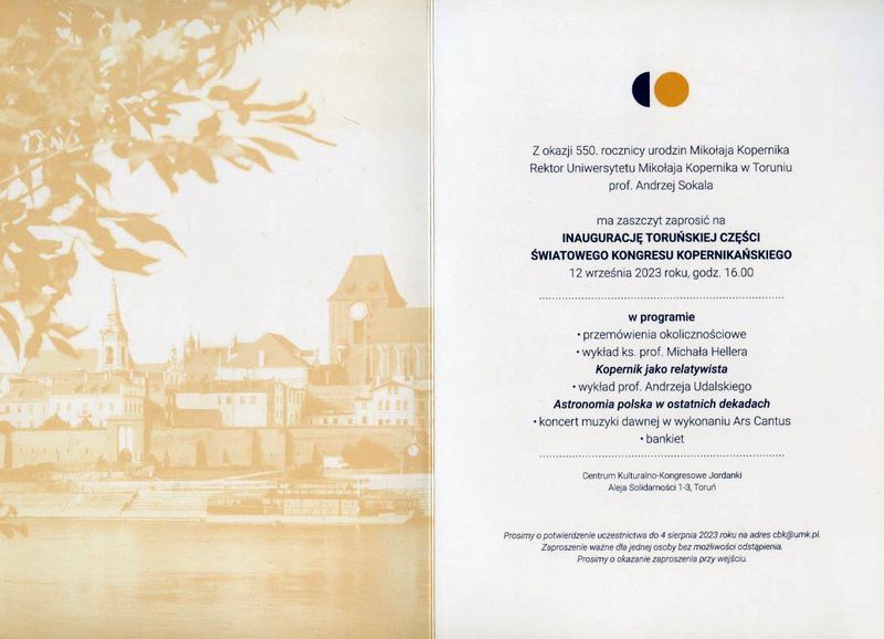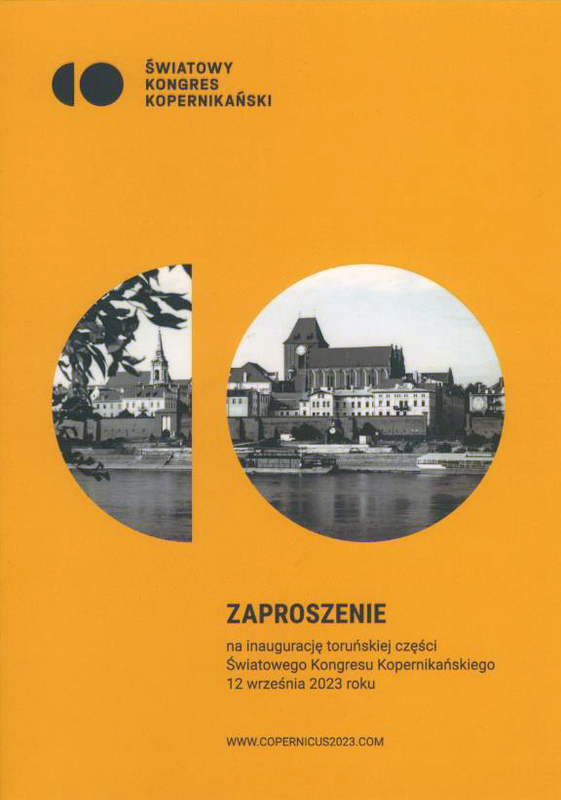 Zaproszenie na inaugurację toruńskiej części Światowego Kongresu Kopernikańskiego 12 września 2023 roku.
